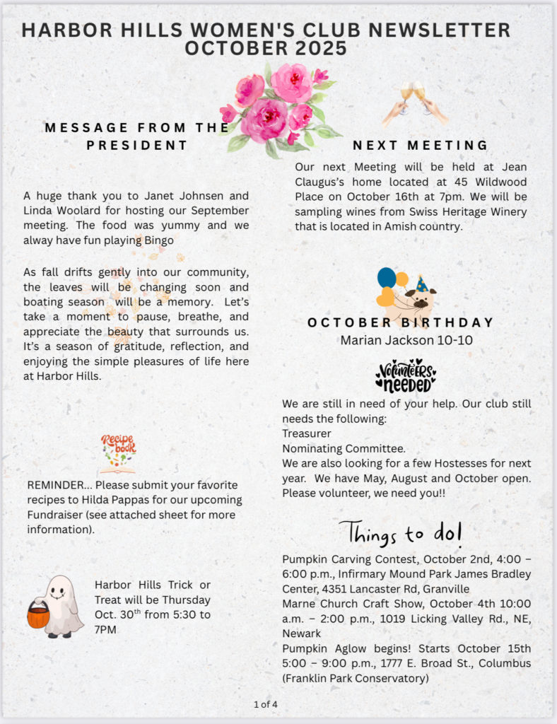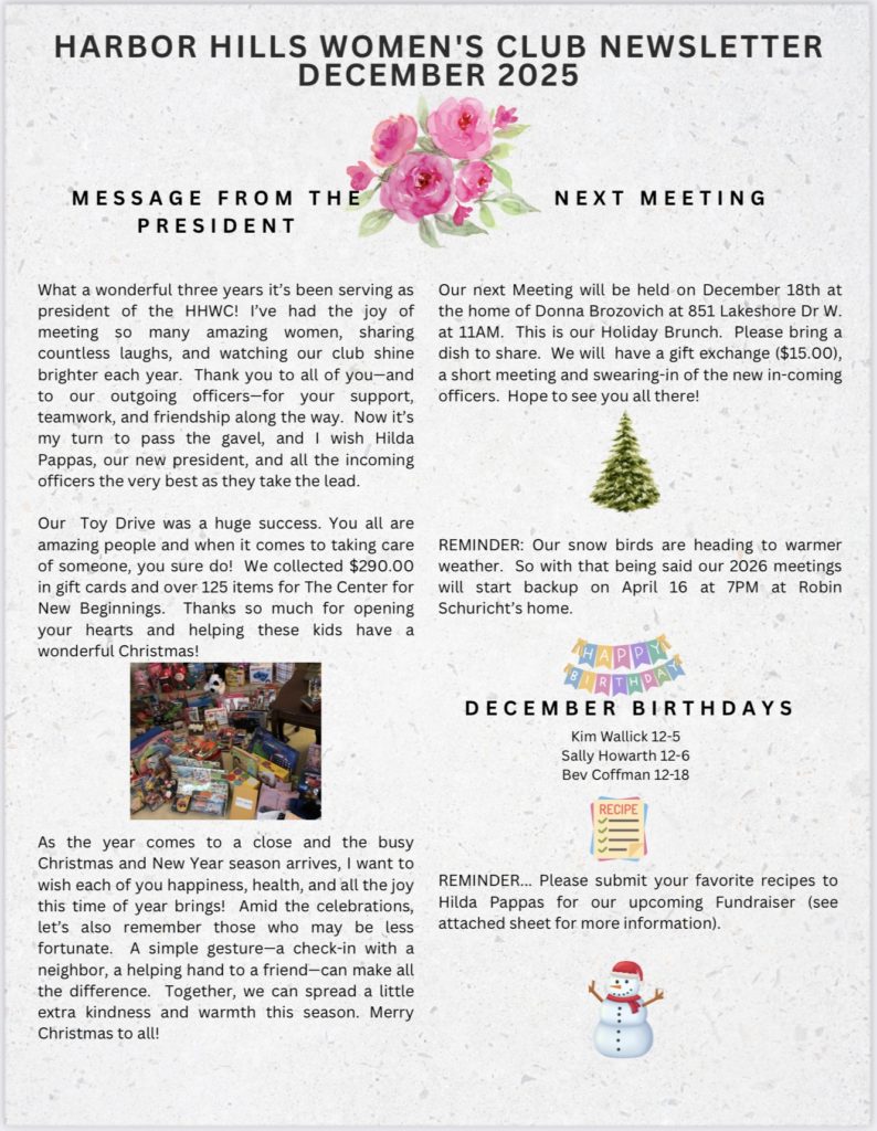 In this section you will find the membership form, a complete list of our HH Women’s Club past presidents, newsletters and other important information that needs to be shared. The Harbor Hills directory that is updated each year has all the meeting dates for the year and a list of all officers and committees for the HH Women’s Club.
